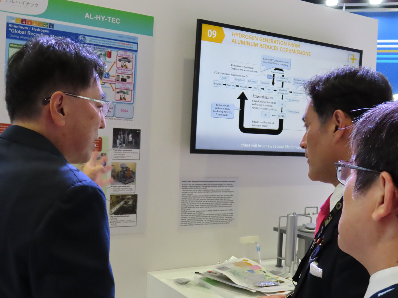 アブダビ国営石油会社(ADNOC)の幹部にアルミ水素の説明をしている様子